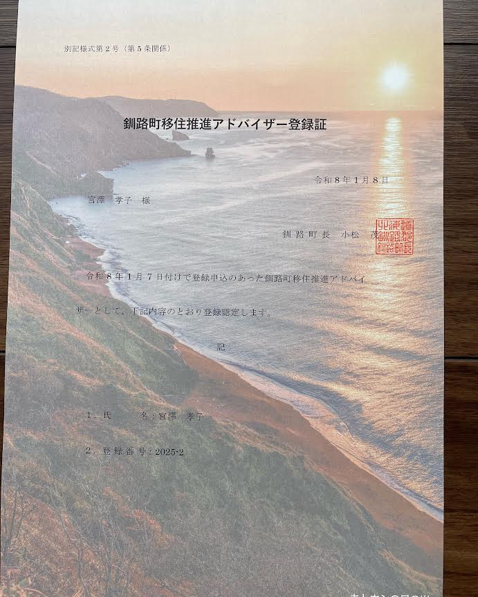 このたび弊社代表取締役 宮澤孝子が、北海道の釧路町より「釧路町移住促進アドバイザー」を拝命いたしました。