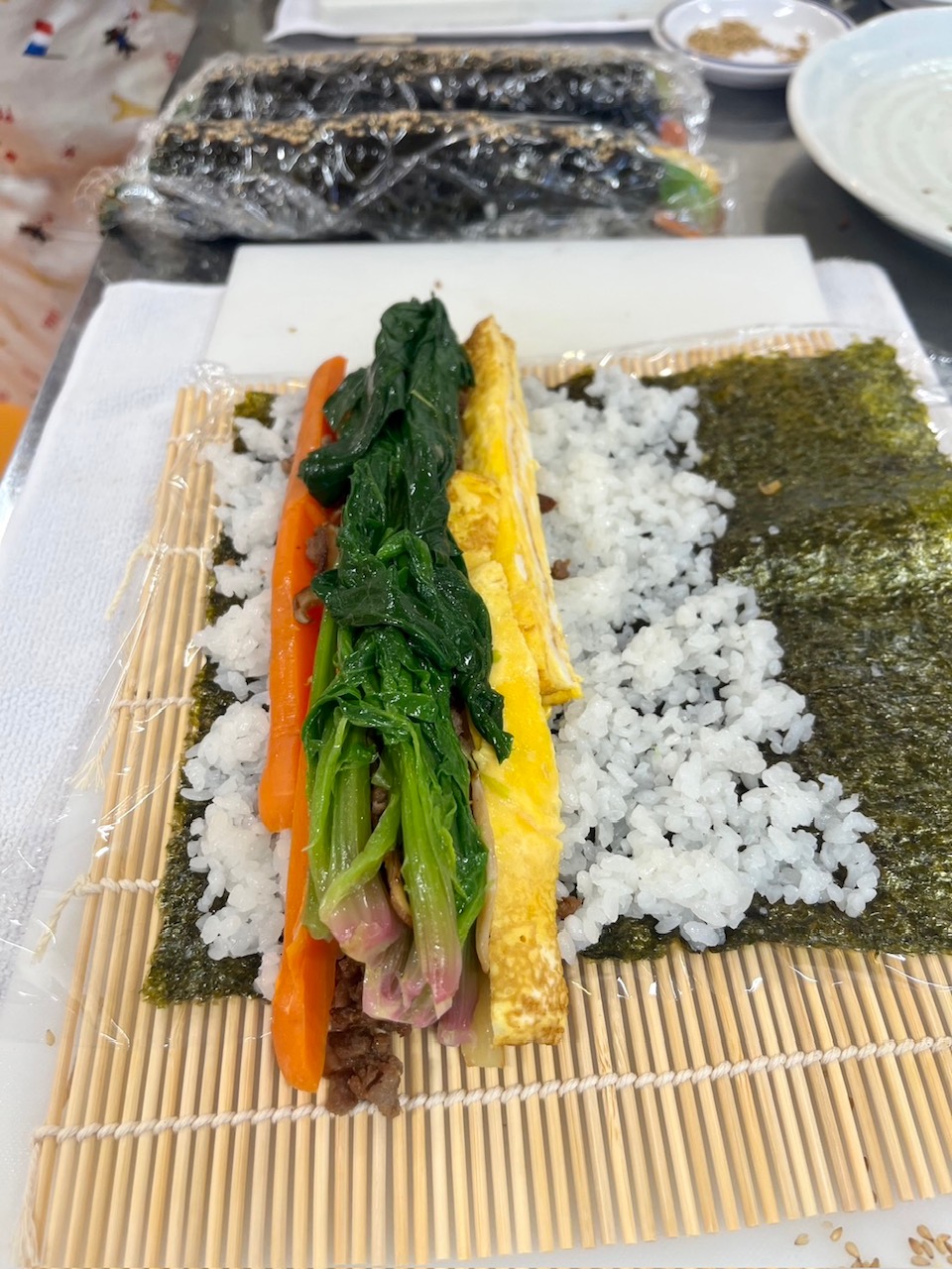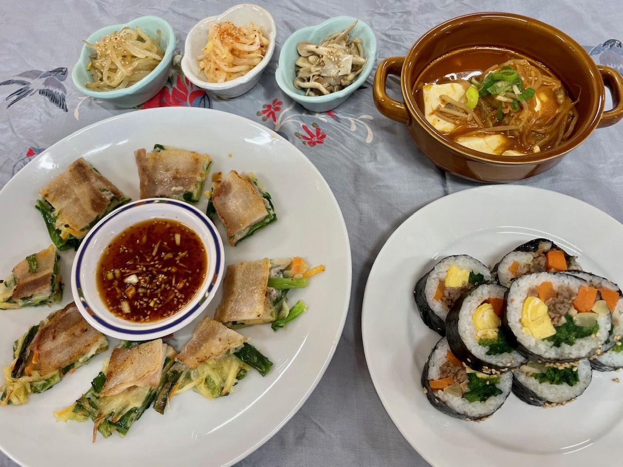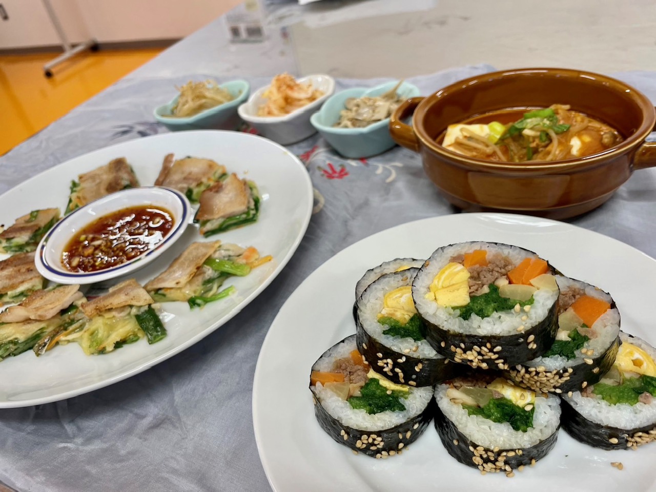 韓国料理でおなじみのキンパは、来月迎える「節分」の太巻きの練習も兼ねて具をたっぷり入れて巻いていくと、切り口がとってもきれいに仕上がり、盛り付けも皆で楽しむことができました。