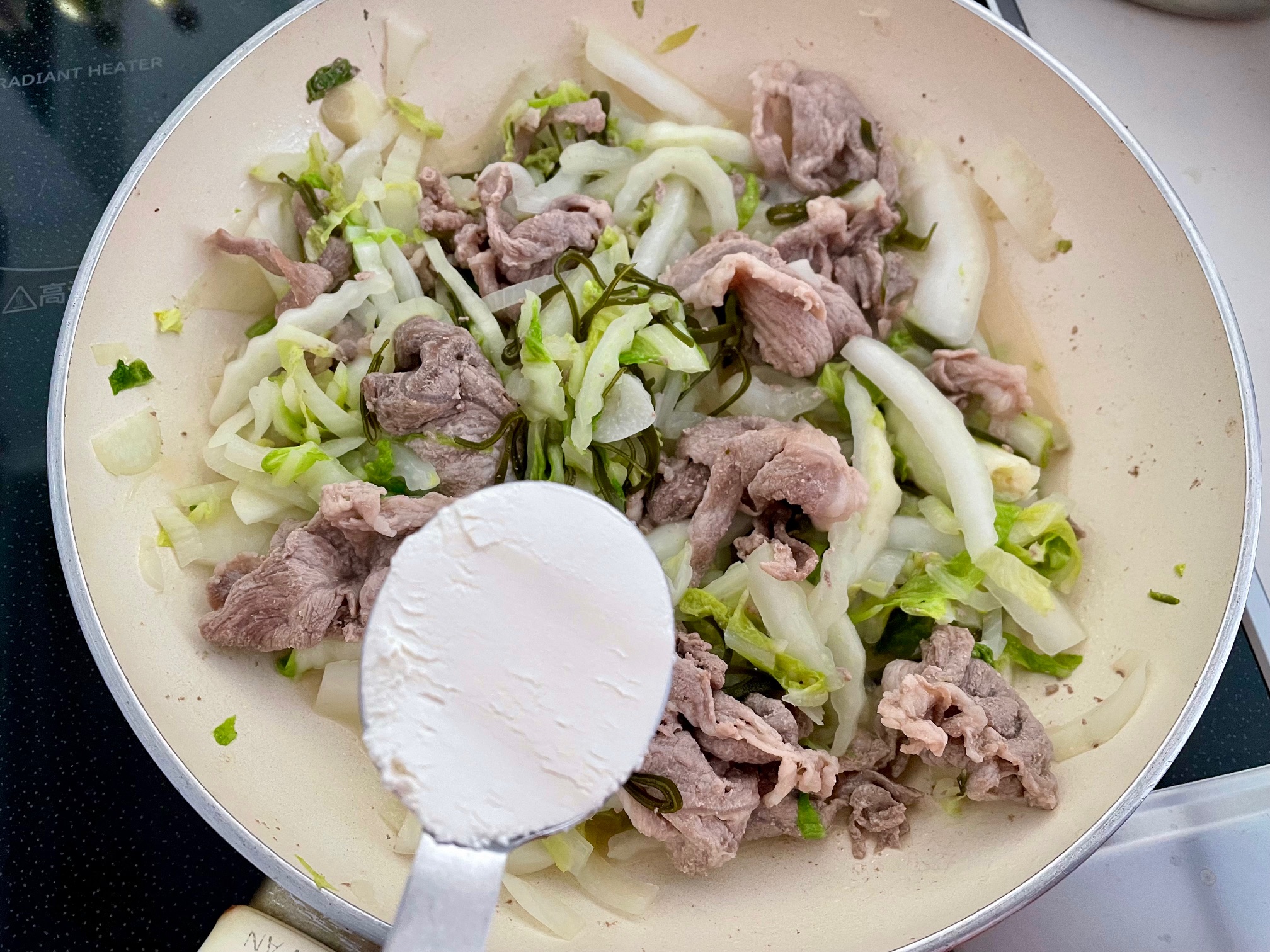 ②フライパンにバターを溶かし、豚肉を炒め火が通ってきたら、玉ねぎ、白菜、昆布を加えて、弱めの中火で炒める
