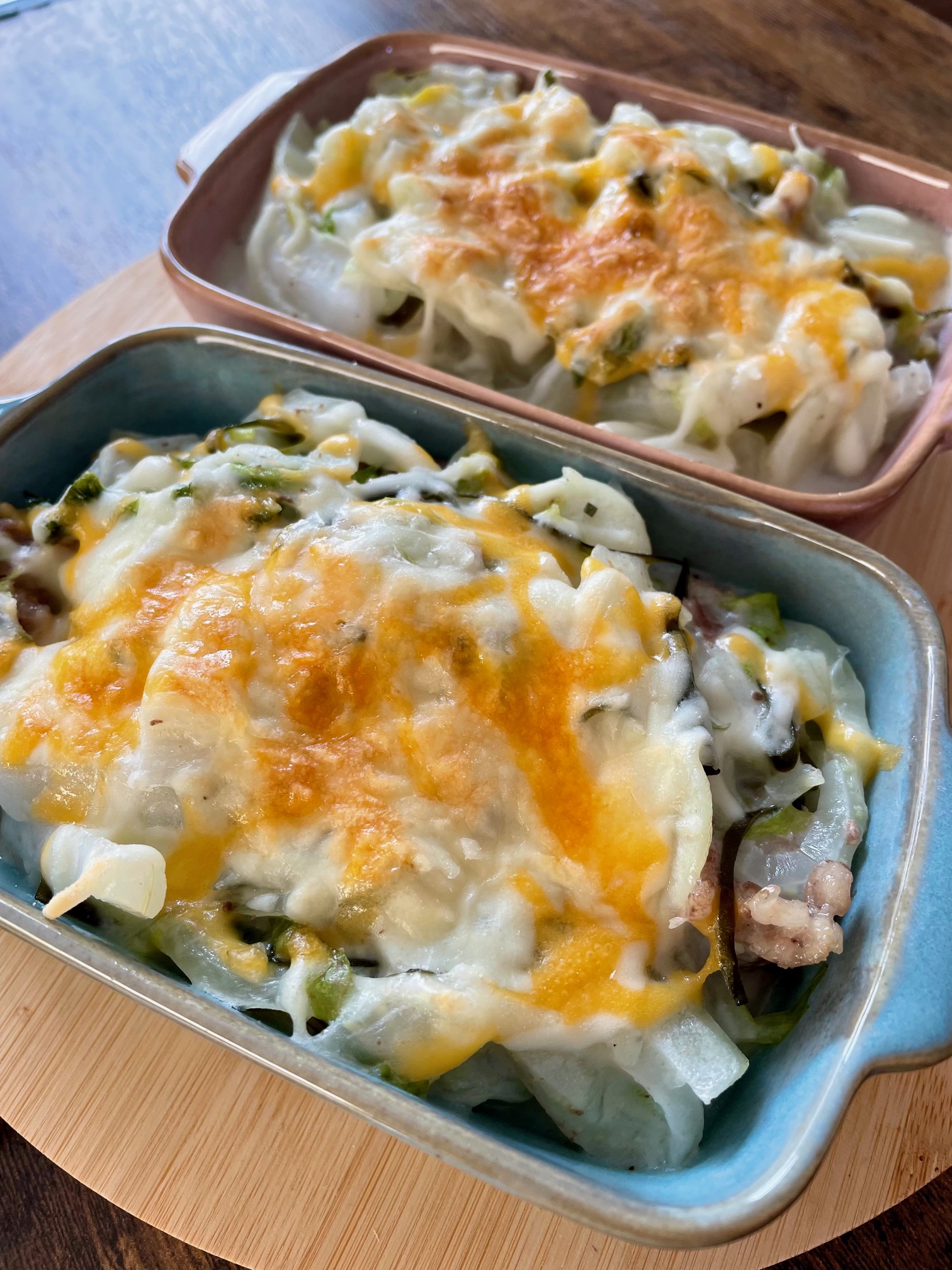 ⑤とろみが出てきたら火を止めて、耐熱皿に移してチーズをまぶし、トースターで5~6分焼く ※時々見ながらほど良い焦げ目に