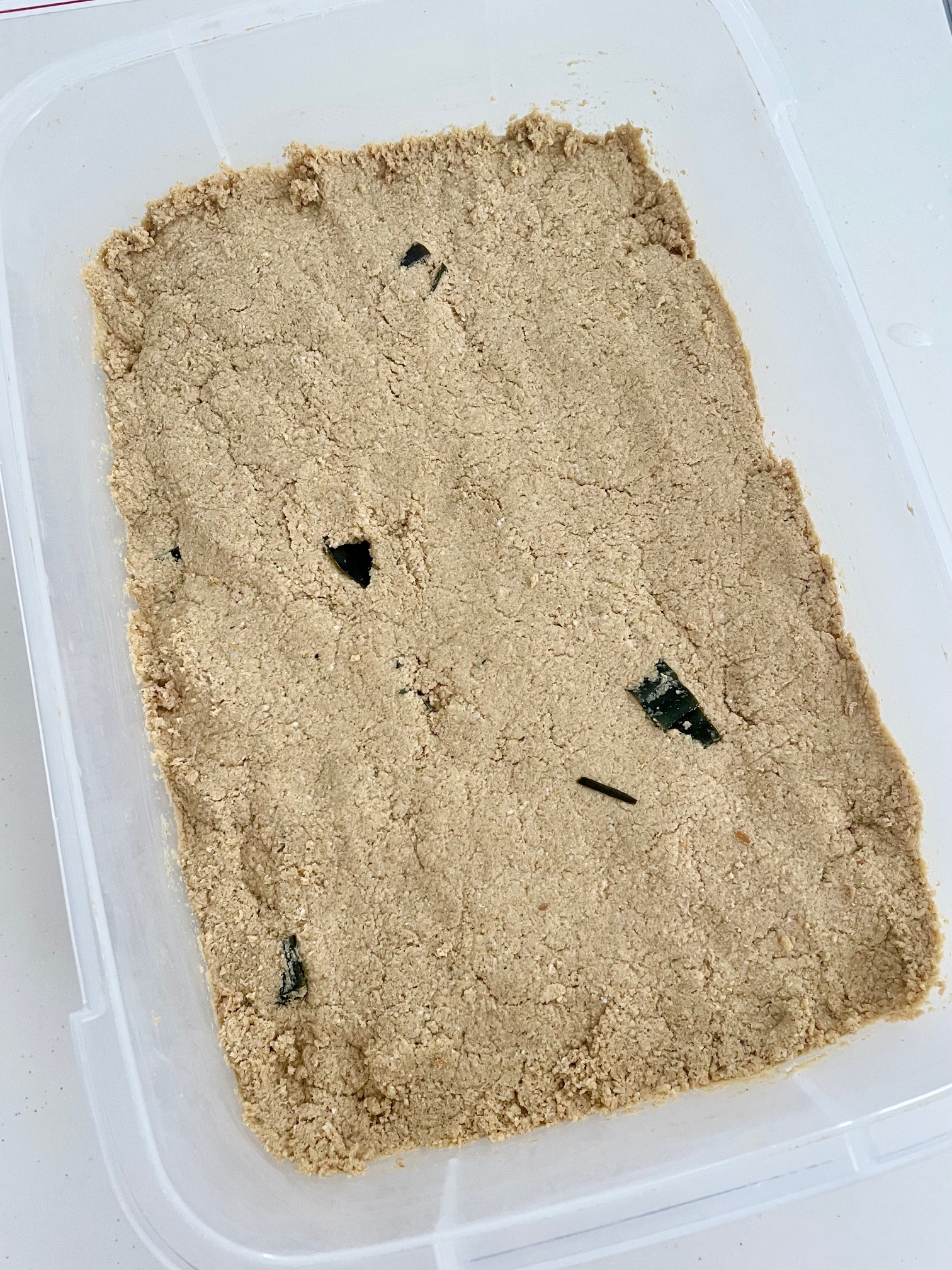②タッパーに炒り糠を入れて、①を回し入れて混ぜ合わせ、昆布と唐辛子を加え混ぜる(味噌ぐらいの硬さ)